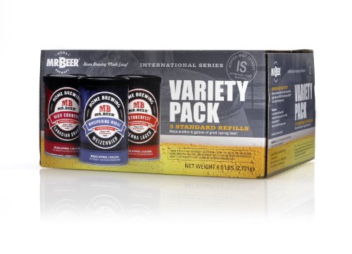 The three beer mix Variety Pack contains everything needed to brew an additional three batches (3 cases) of premium beer. Includes Whispering Wheat Weizenbier, High Country Canadian Draft, and Octoberfest Vienna Lager flavor beer mixes, 3 Booster Packs for flavor enhancement and alcohol boost, and 3 One-Step cleanser.Mr. Beer 3-Beer Mix Variety Pack Specifications